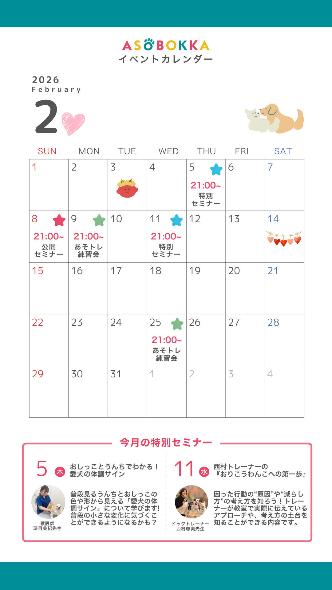 ✏️ < 今月の特別セミナーは「おしっこ・うんち」と「お困りごと」!